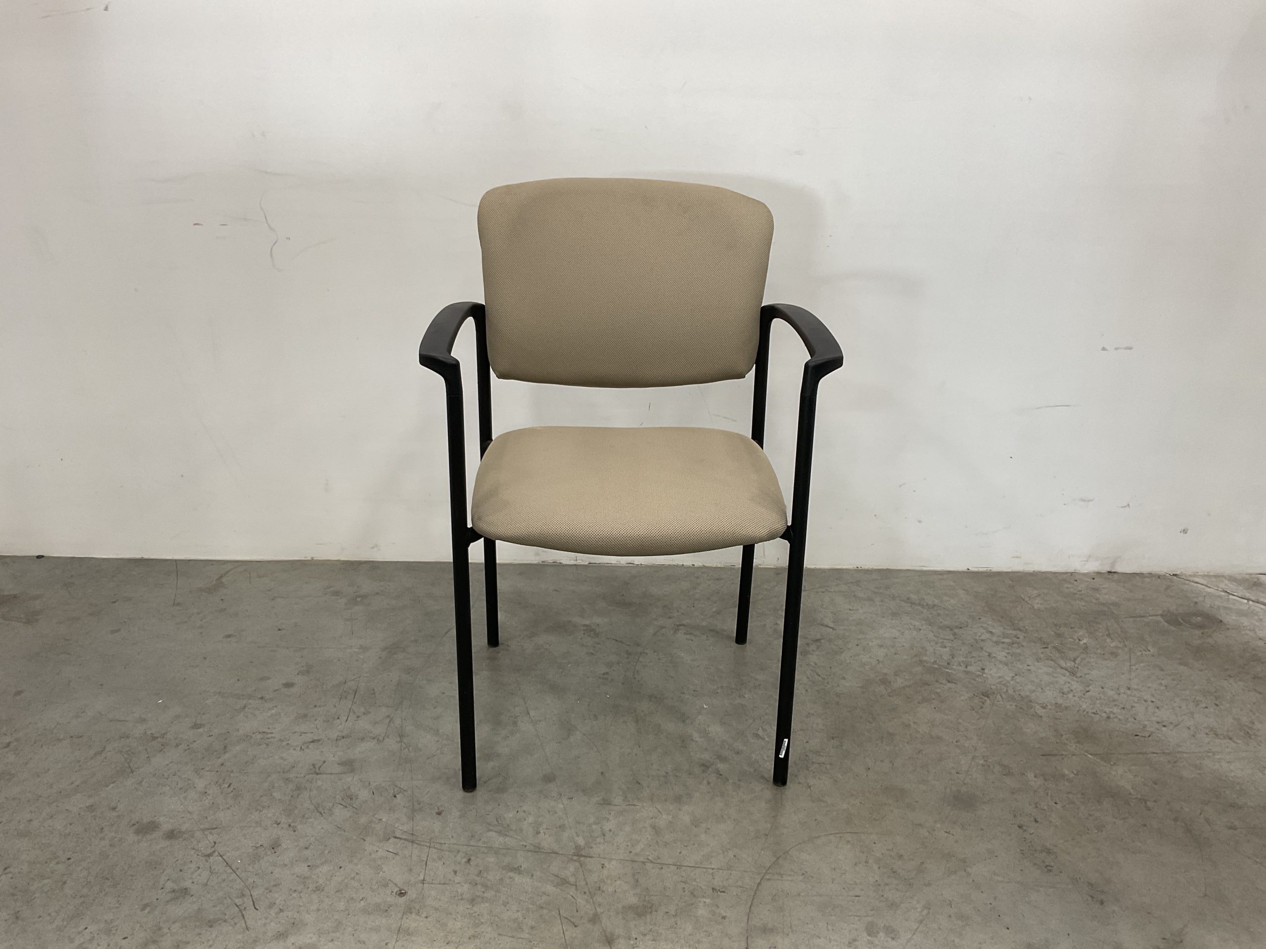 This beige fabric guest chair offers reliable comfort and a clean, professional look—ideal for waiting rooms, office reception areas, or conference settings. The padded seat and backrest provide supportive seating, while the black steel frame ensures lasting durability. Curved armrests add a touch of ergonomic comfort, and the chair’s compact design allows for easy placement in a variety of environments.